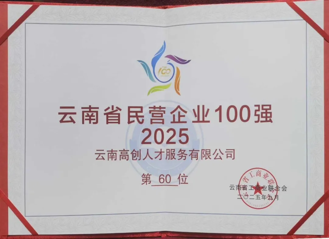 双榜登科!云南高创人才服务有限公司闪耀2025云南民企百强榜!凭借专业的人才服务能力与稳健的经营发展态势,荣获云南省民营企业领域两项重要殊荣: